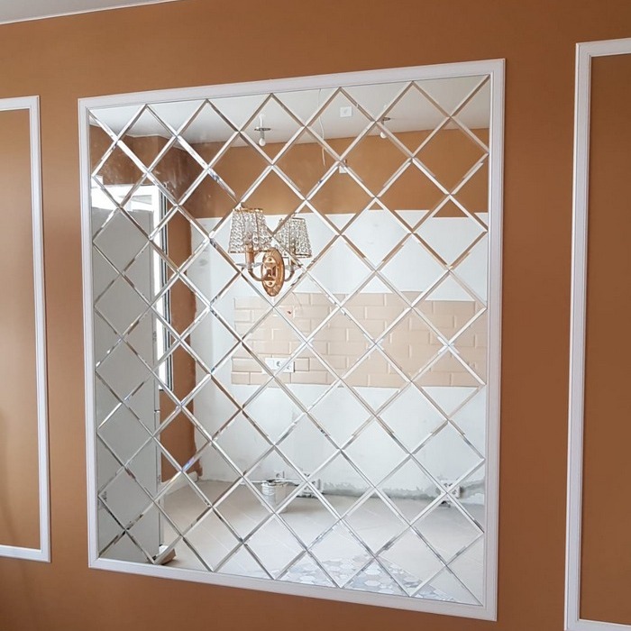 Для украшения использовалась зеркальная плитка формы вытянутый ромб серебряного цвета.